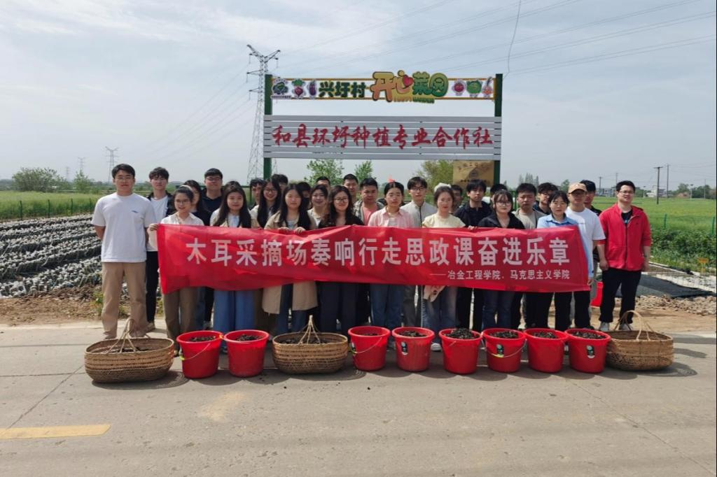 为深化新时代劳动教育内涵,推动党建工作与专业实践的深度融合,4月16日,马克思主义学院与冶金工程学院师生共同前往和县历阳镇兴圩村黑木耳产业园劳动教育合作基地,联合开展“行走的思政课”暨劳动教育实践活动。两院师生通过“实地”调研、“劳动”实践与理论研讨相结合的方式,在田间地头深刻感悟劳动精神,进一步厚植家国情怀。