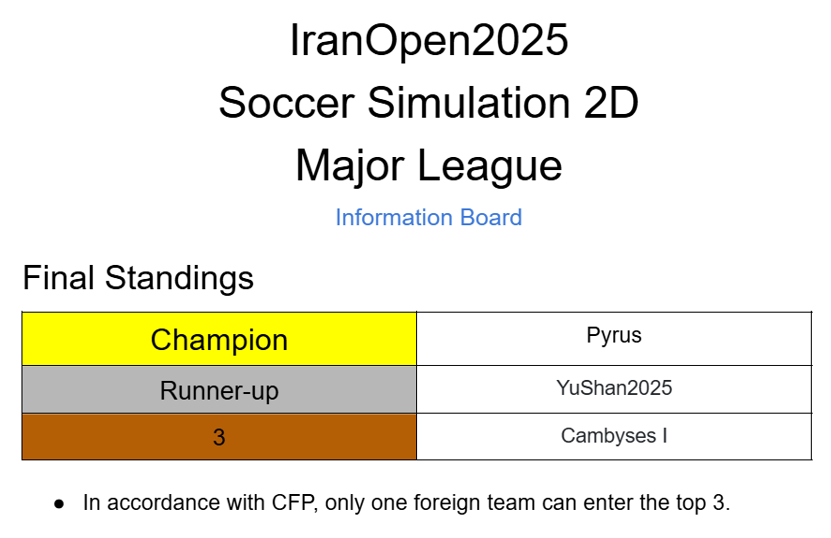 4月18日至22日,RoboCup伊朗公开赛在德黑兰市举行,计算机科学与技术学院程泽凯老师指导,由张宇航、柴天泽等同学参加的YuShan机器人足球队远程在线参加仿真2D组比赛,经过激烈的争夺,我校YuShan队通过加时力克巴西伯南布哥联邦大学RoboCin队杀入决赛,最终不敌Pyrus队(RoboCup2024荷兰世界杯亚军),斩获亚军。