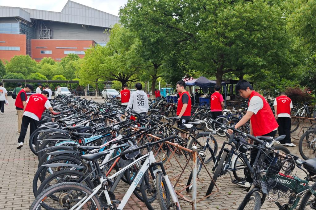 活动当天,师生志愿者分为自行车整理组和卫生清扫组展开行动。在后勤处老师的指导下,自行车整理组的同学将宿舍楼前随意停放的自行车逐一归位,按区域整齐摆放,并对车辆进行清洁维护,确保公共通道畅通无阻;卫生清扫组的同学手持扫帚等工具,对J栋宿舍楼周边道路、绿化带及公共区域进行细致清理。经过两小时的协作劳动,宿舍区环境焕然一新,公共空间秩序井然,有效提升了宿舍区的整洁度和安全性。