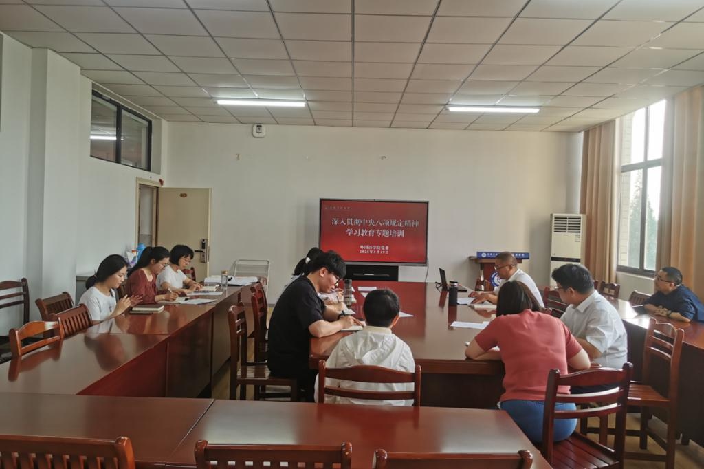 5月19日下午,为进一步深入贯彻中央八项规定精神学习教育,强化作风建设,外国语学院召开深入贯彻中央八项规定精神学习教育专题培训会,院党委书记王成勇,院党委副书记、纪委书记、副院长施铜兴,以及院科级干部、新提拔干部、重点岗位干部、全体辅导员和办公室全体工作人员参加会议。会议由王成勇主持。