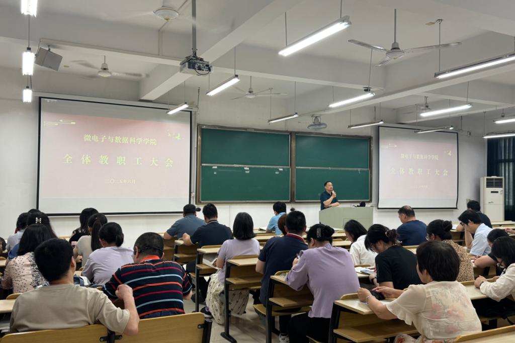 6月9日下午,微电子与数据科学学院在数理楼403召开全院教职工大会。会议由学院党委书记汪春胜主持,全体教职工参加了会议。