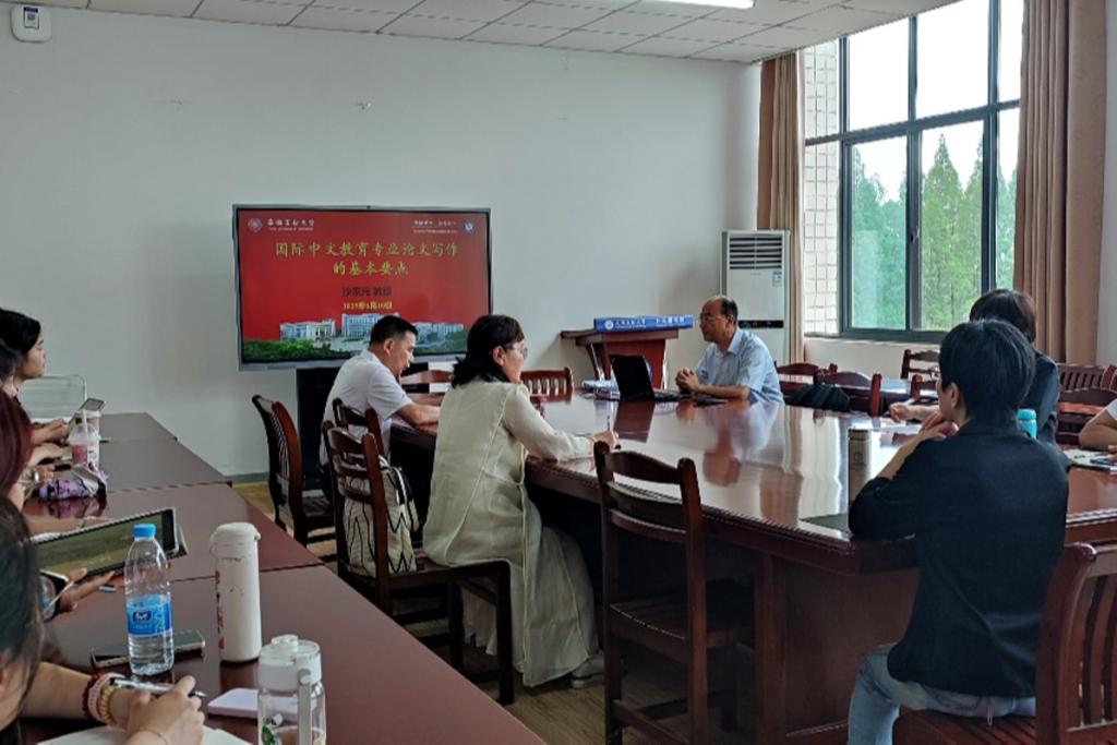 为规范国际中文教育专业硕士研究生学位论文写作,提升人才培养质量,6月10日下午,外国语学院在佳山校区教一407会议室举办第三十一期“筑梦学术论坛”。此次论坛特邀安徽大学文学院语言学及应用语言学专业、国际中文教育专业研究生导师,安徽省汉语国际教育研究会副会长沙宗元教授作题为“国际中文教育专业论文写作的基本要点”的学术讲座。外国语学院骨干教师及国际中文教育专业研究生聆听了报告,本次讲座由外国语学院副院长马广利主持。