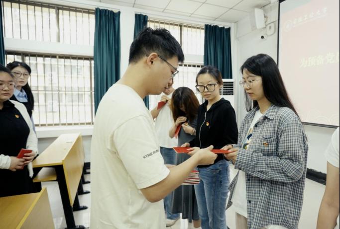 伴随着庄严的《国际歌》,入党宣誓仪式正式开始,冀秀芝宣读了学院党委关于新发展党员的批复。全体新党员在党旗下庄严宣誓,激昂的宣誓表达了大家对党忠诚的决心。新发展党员代表王梦艳同志及老党员代表王婷同志做了发言,表达出作为学生党员,要时刻保持党员的先进性和先锋模范带头作用的决心和信心。仪式上,各学生支部书记还为新发展党员佩戴了中国共产党党徽,颁发了《中国共产党章程》。