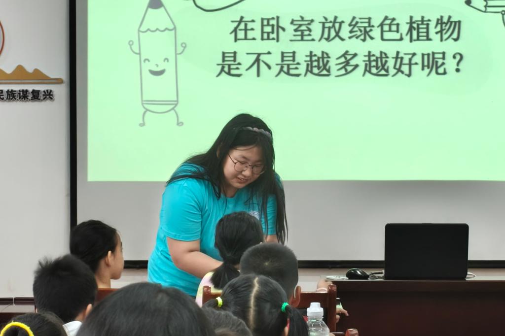 在创作结束后的互动交流环节,孩子们踊跃分享感受,纷纷表示要爱护花草树木,让地球更美丽。实践队队员肯定并鼓励他们的想法,还引导思考日常环保行动,孩子们积极响应,承诺从自身小事做起保护环境。