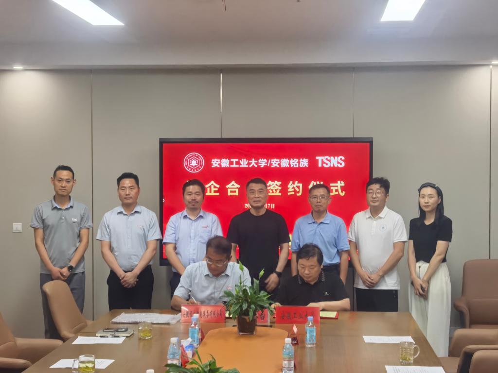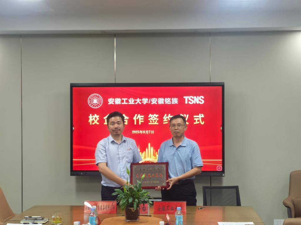 在安徽铭族智能装备有限公司,柳东明一行在官亭镇党委书记马海林、公司董事长韩正强的陪同下,深入企业生产车间,详细了解企业运营现状、核心业务布局及人才需求情况。座谈会上,校企双方首先对各自情况进行了介绍,双方围绕材料学院相关专业与企业岗位需求的契合点深入探讨,就人才培养、产业实践协同发展达成共识。校企双方签订了人才培养与就业基地建设合作协议,并颁授大学生就业基地牌匾。