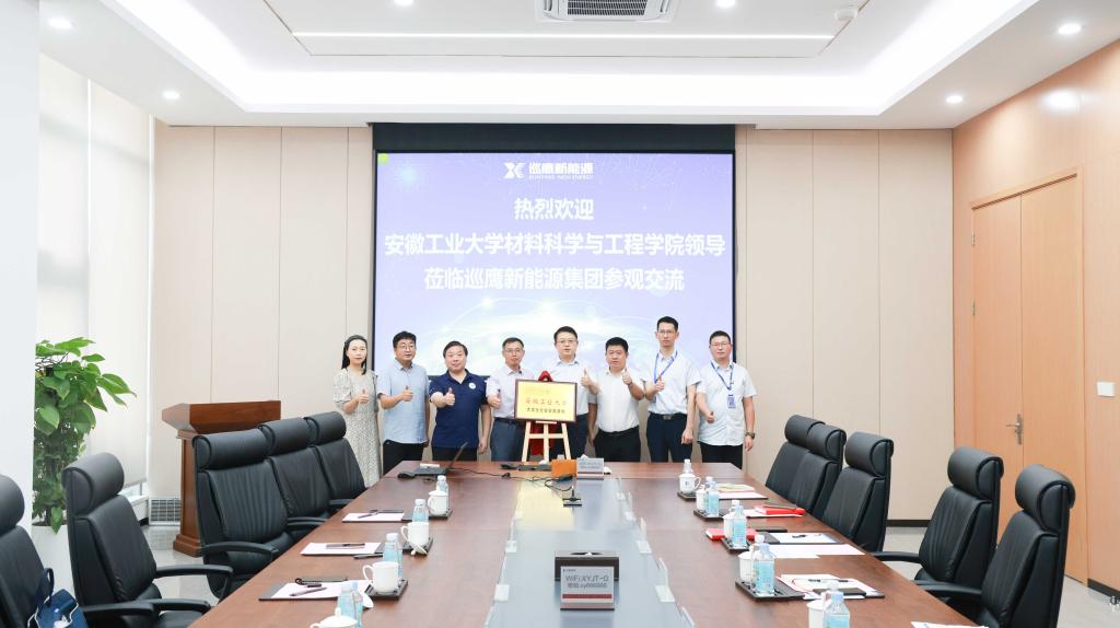 在安徽巡鹰新能源集团有限公司,柳东明一行依次参观了企业展厅及材料研发测试中心,并与集团副总经理茆海东、行政总监欧小卫、材料研究院院长宋二涛、人力资源总监李秋华,聚焦技术研发与人才培养等方面进行了深入交流。材料学院主动征询企业对人才培育的建议,并热情邀请企业来校组织招聘活动。学院向安徽巡鹰新能源集团有限公司授牌大学生社会实践基地。