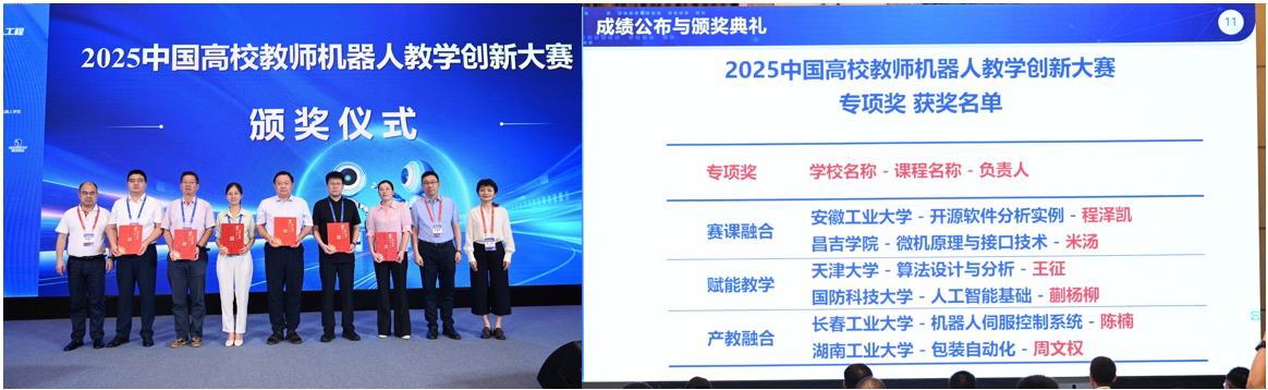 大赛由中国自动化学会主办,旨在推进高校机器人竞赛与创新教育教学改革,建设机器人“课堂教学-基础实践-竞赛创新”高素质教师队伍,助力人工智能与机器人领域人才培养与成果创新。同时,大赛设立“AI 赋能教学”专项奖、“课赛融合”专项奖、“产教融合”专项奖。