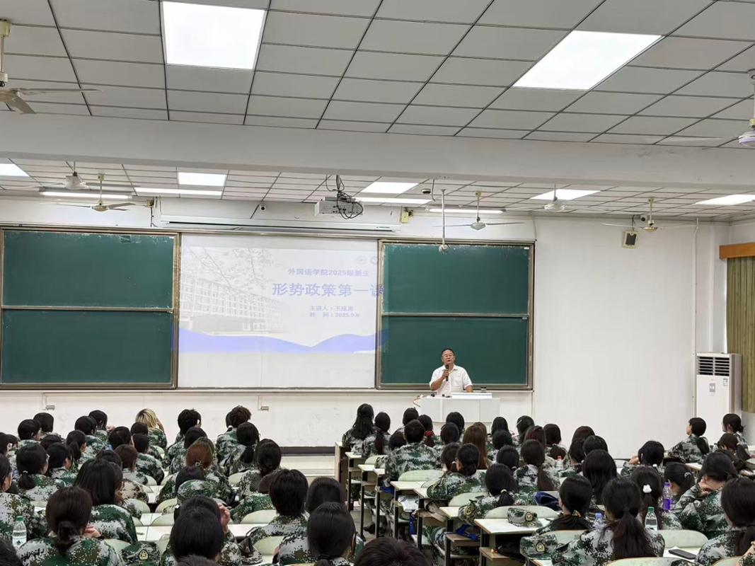 9月8日下午,外国语学院在教三南201教室开展新生形势政策第一课,学院党委书记王成勇,副书记施铜兴,新生辅导员和全体2025级新生参加。