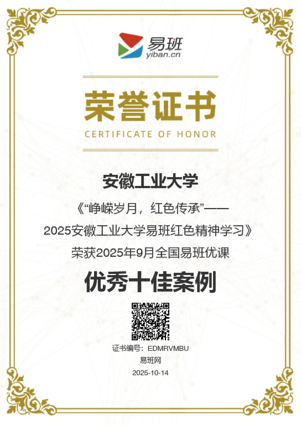 10月14日,教育部易班发展中心公布了2025年月度全国易班优课优秀十佳案例评选活动9月评选结果,我校《“峥嵘岁月,红色传承”——2025安徽工业大学易班红色精神学习》获评2025年9月全国易班优课优秀十佳案例。