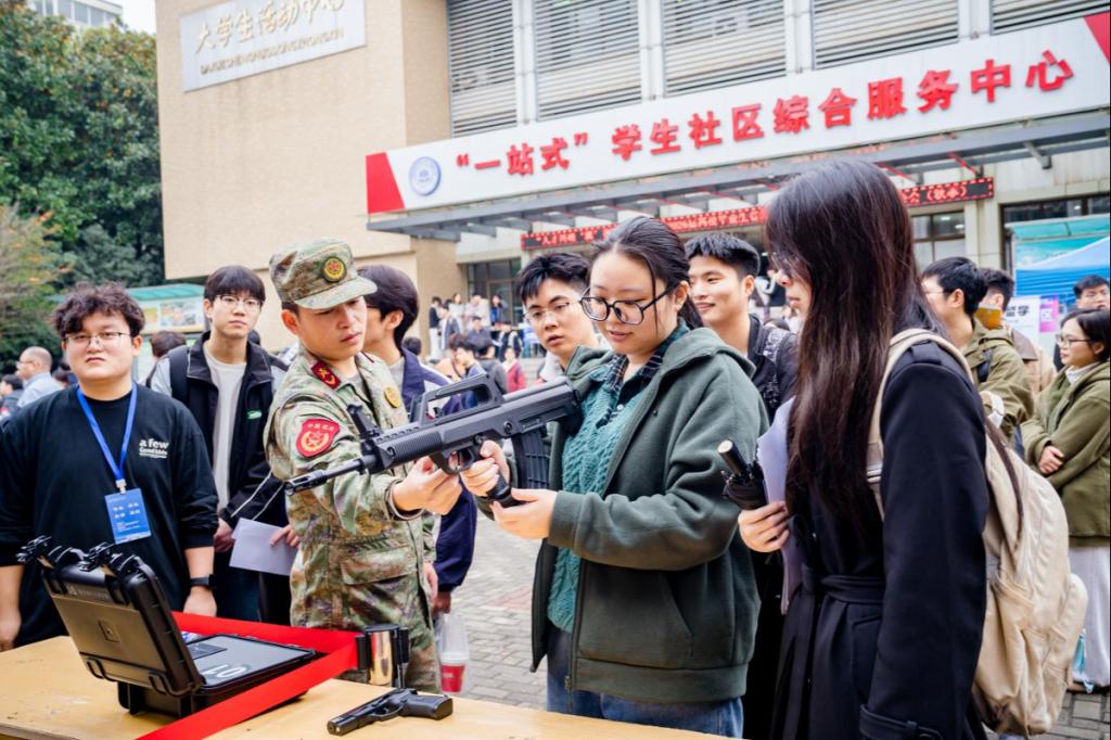 11月8日,“人才兴皖 ‘就’在江淮”安徽省2026届高校毕业生省级系列就业招聘会皖南地区分会暨安徽工业大学2026届毕业生秋季双选会现场,校征兵工作站联合马鞍山市花山区人武部举办征兵宣传暨军事装备体验活动,让学子们零距离感受军事魅力。