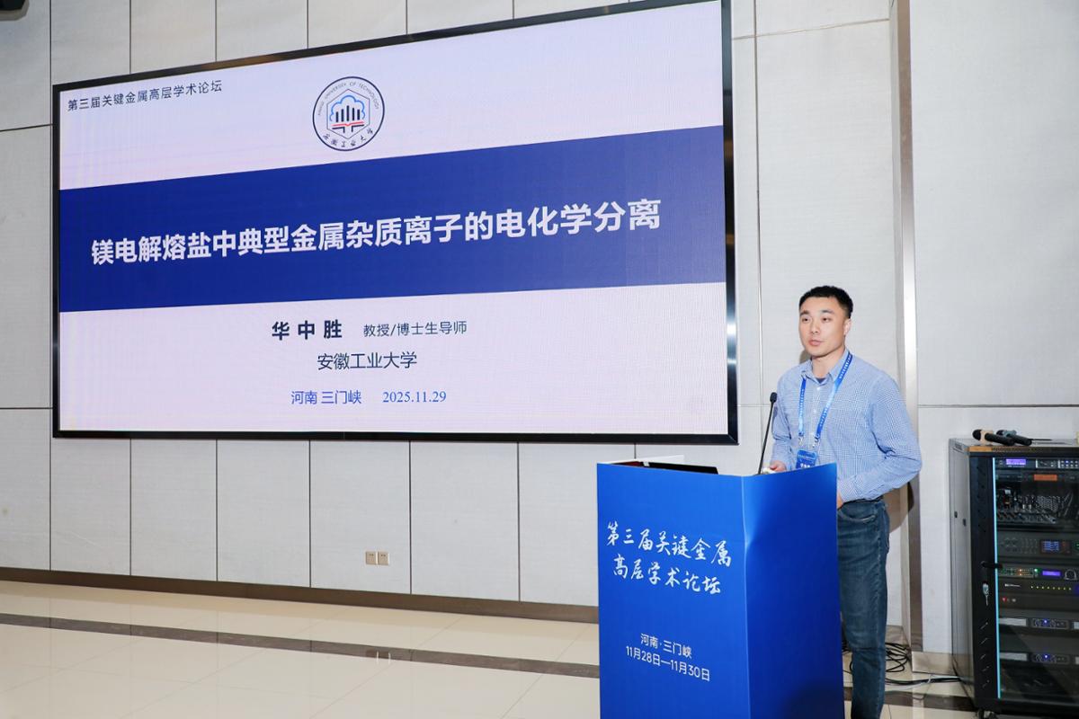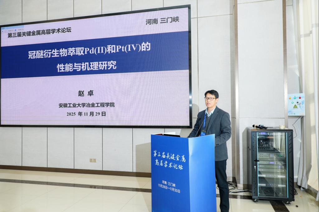 我校冶金工程学院赵卓教授与华中胜教授应邀参会。赵卓教授担任“关键金属循环与材料再生利用”分论坛主席。两位教师分别作了题为“冠醚衍生物萃取Pd(III)和Pt(IV)的性能与机理研究”和“镁电解熔盐中典型金属杂质离子的电化学分离”的学术报告,系统介绍了我校在关键金属高效提取与高纯制备方面的最新科研进展,引发了与会专家的广泛关注与讨论。