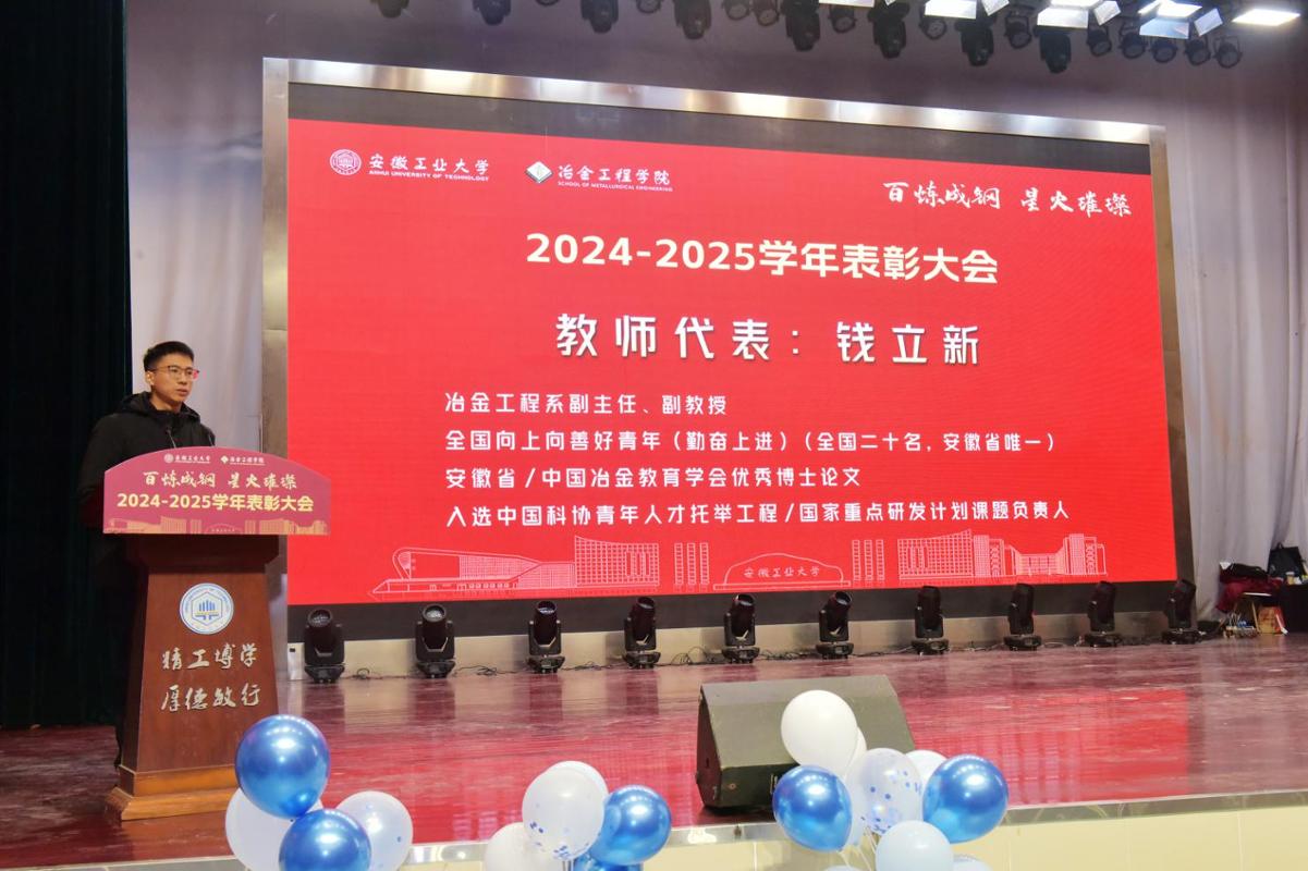 学院党委书记路壮志宣读了表彰通报。校先进班级型223班的黄诗云、张天乐讲述了班级建设的事迹与成果;国家奖学金获得者、冶243班汪静萱分享了从懵懂新生蜕变为专业第一的成长感悟;获奖教师代表、冶金工程系钱立新深情回顾了自己坚守育人初心的奋斗经历。与会领导为获奖先进集体和个人颁发了荣誉证书,学生代表向获奖老师献花致敬。