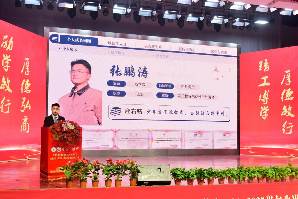在典型事迹展示环节,校“十佳班级”代表融221班张文静同学讲述了先进班级创建的主要事迹;商221班俞睿达分享了个人在校期间的求知之路;校第28届研究生支教团成员、商222班张鹏涛号召同学们要积极投身实践、服务基层;北京盈科(合肥)律师事务所股权高级合伙人、商学院2009届市场营销专业校友王其祥分享了个人情系母校、砥砺前行的奋斗历程;全国模范教师、二级教授洪功翔老师结合个人从教历程,分享了个人有信仰、有追求的教育初心。