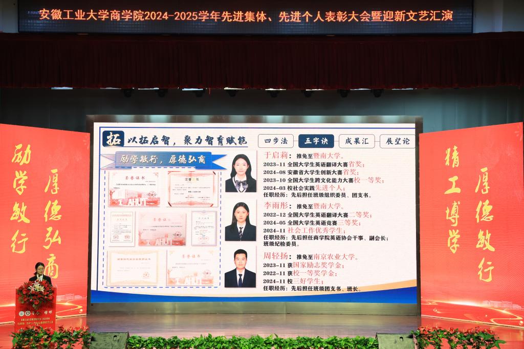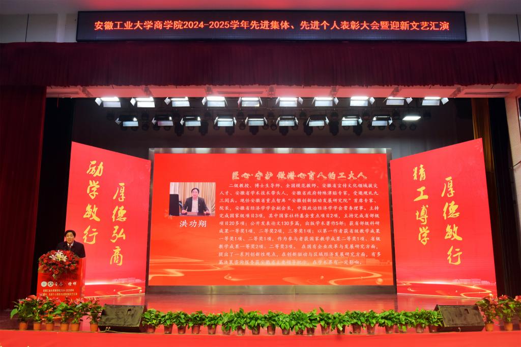 1月5日下午,商学院2024—2025学年“青春·榜样”先进集体、先进个人表彰大会暨迎新文艺汇演在秀山校区大学生活动中心报告厅举行。校党委副书记王俊出席大会并为获奖代表颁奖。中国电信马鞍山分公司总经理张磊,中国电信马鞍山分公司政企部主任胡志文,全体院领导,优秀校友代表,各系室主任(党支部书记),各学位点负责人,受表彰的先进集体、先进个人代表,教师和高年级学生代表,2025级新生参加大会。