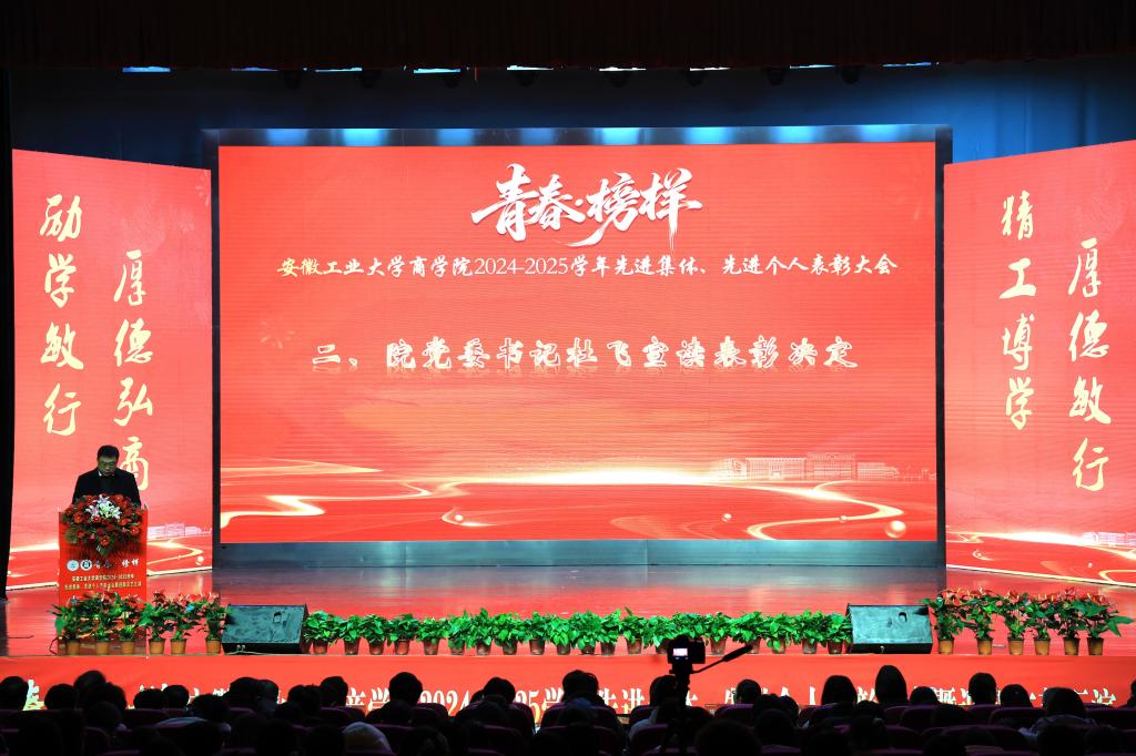 院党委书记杜飞宣读商学院2024—2025学年先进集体、先进个人的表彰决定,他对青年学子提出了3点希望:要明德修身,筑牢品德之基,做到明大德、守公德、严私德,做到心有所畏、言有所戒、行有所止;要刻苦求学,锻造过硬本领,唯有向学、善学,才能积累开创未来、参与竞争的能力本领;要胸怀家国,逐梦中华复兴,要把自己的理想同国家的前途、把自己的人生同民族的命运紧密联系在一起,扎根人民,奉献国家。