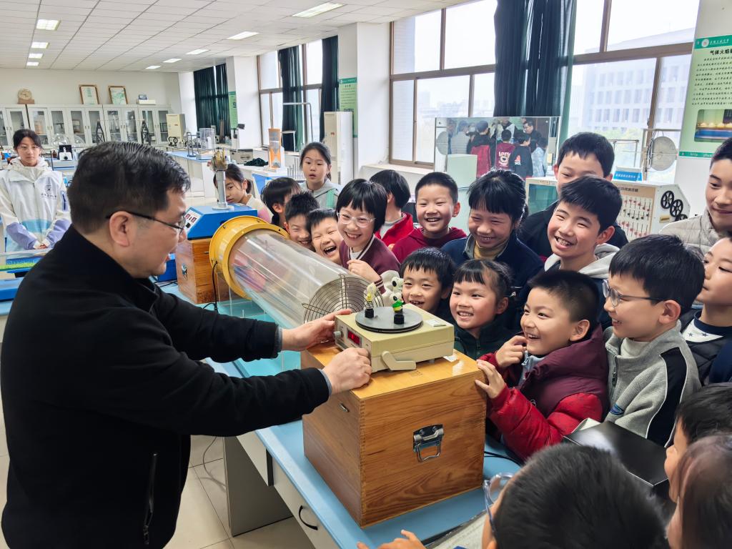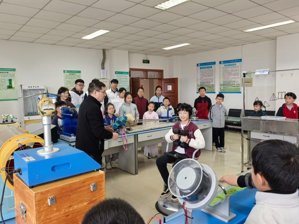 在安徽省科普教育基地展厅,孩子们在“长三角”优秀志愿服务队“数理行知”志愿者引导下有序签到、聆听安全须知,并分组开展研学。在“科普探秘”环节,孩子们参观了基地展厅,了解学校发展历程与科普资源建设成果;随后,一场生动有趣的《生活中的科学小奥秘》趣味科普课,通过“为什么天空是蓝色的”“静电从何而来”等贴近生活的案例,点燃了孩子们的求知热情。最受期待的“科普基地实践”环节中,孩子们走进实验室,近距离观摩基础工科实验演示,亲手操作简单仪器,感受工科魅力。从光学现象到电路连接,每一个实验都引来阵阵惊叹,科学的种子在孩子们心中悄然萌发。