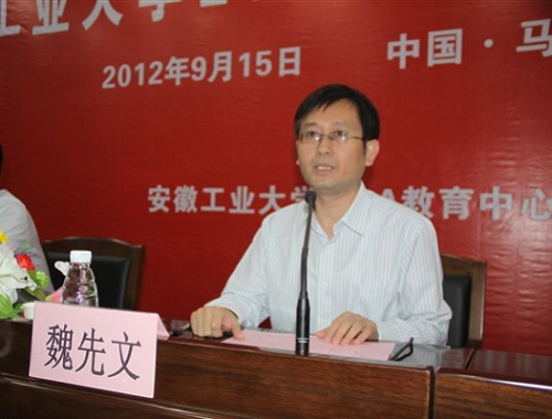 魏先文首先发表了讲话,他代表安徽工业大学全体师生员工对2012级新同学的入学表示热烈的欢迎和诚挚的祝贺。魏先文向新同学们介绍了安徽工业大学近年来的蓬勃发展态势、MBA的发展特色和已取得的成绩,肯定了同学们“挑战自我,充实自我,提升自我”的学习精神,也对同学提出殷切希望。言语之中,对安工大MBA的发展、对学员们的未来充满寄托和期待。