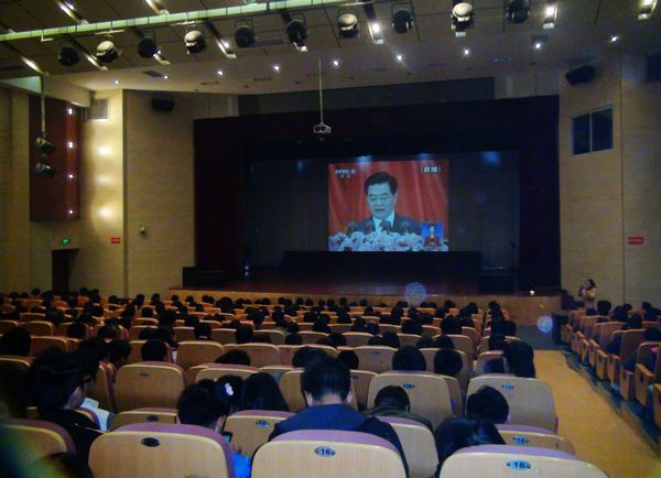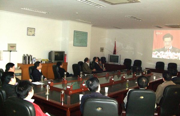 上午九点整,校党委中心组成员集中在会议室收看电视实况直播,聆听胡锦涛在大会上所作的报告。他们边看边交流,听到激动处,也情不自禁地跟着鼓起掌来。