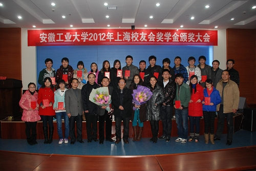 12月18日下午,安徽工业大学2012年“上海校友会奖学金”颁奖大会在振华图书馆一楼学术报告厅举行。上海校友会秘书长唐晓彤校友、上海欣茂华装饰工程有限公司总经理王满真校友,副校长葛芦生和学生工作部、校友总会办公室负责同志参加了颁奖大会,并为20名获奖同学颁奖。