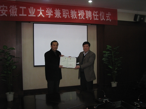 李家新对徐东平到校表示热烈欢迎,并向他简要介绍了我校基本情况。徐东平教授在讲话中表示很高兴受聘为我校兼职教授,并将以此为平台加强与我校的交流。会谈过后,李家新校长为徐东平教授颁发了安徽工业大学兼职教授聘书。