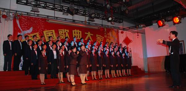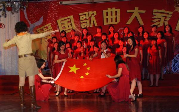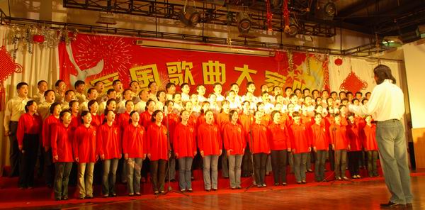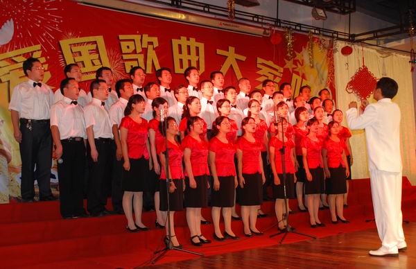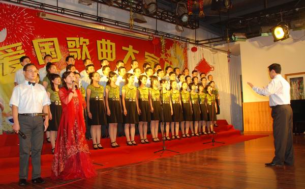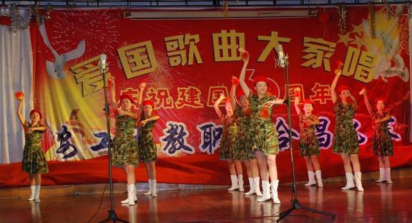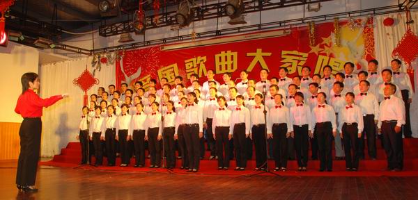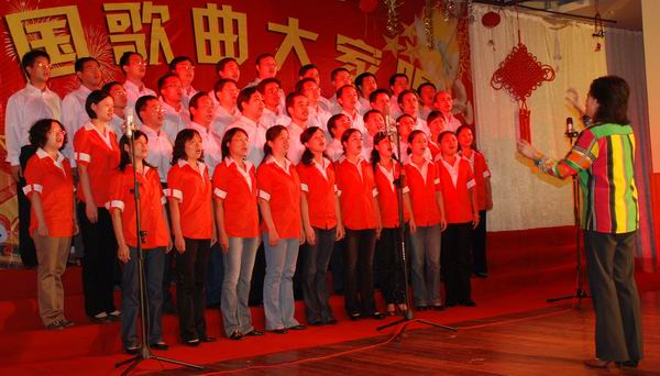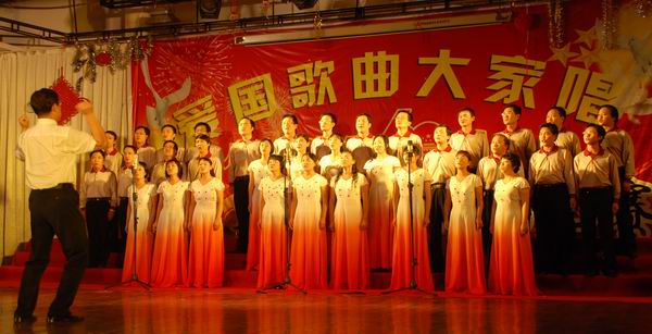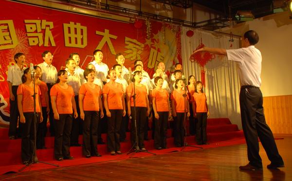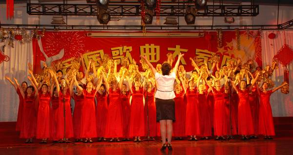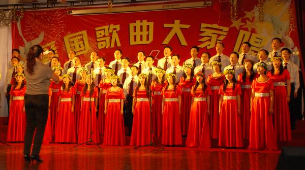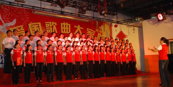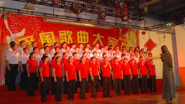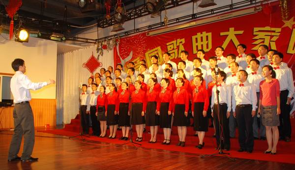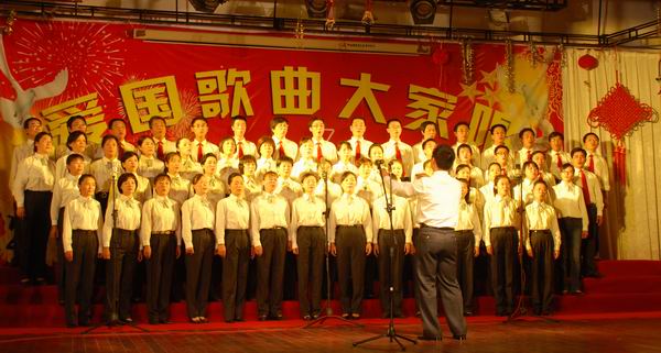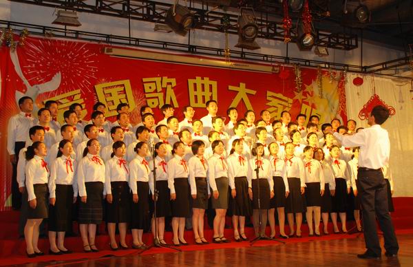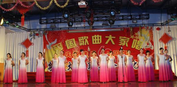 “我和我的祖国一刻也不能分割,无论我走到哪里都流出一首赞歌,我歌唱每一重高山,我歌唱每一条河,袅袅炊烟小小村落,路上一道辙……”9月27晚,在东校区大学生活动中心,嘹亮而慷慨的爱国歌曲不停响起,由校工会主办,校党委组织部、宣传部、团委等协办的庆祝建国60周年“爱国歌曲大家唱”教工合唱比赛浓情上演。一曲曲歌颂祖国的优美歌曲回荡在荟灵湖畔。