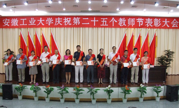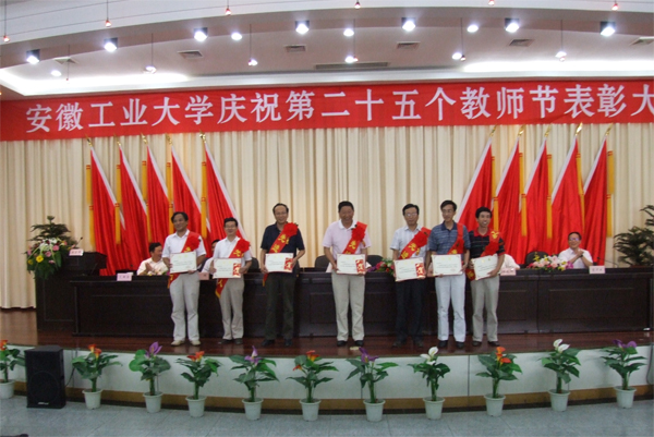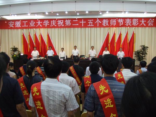 金秋九月,天高气爽,我们满怀欣喜之情迎来了第二十五个教师节。9月10日下午,安徽工业大学庆祝第二十五个教师节表彰大会在学术会议中心四楼报告厅隆重召开。在校校领导李辉生、岑豫皖、林钟高、汪光阳、陈润、葛芦生、张国宝,与近年来获得各类荣誉的集体和个人一起出席表彰大会。全体教授、博士,教学单位党支部书记、各系(室)主任,全校副科级以上干部参加了大会。校党委书记李辉生在会上讲话,校长岑豫皖作教师节致辞。大会由校党委副书记汪光阳主持。