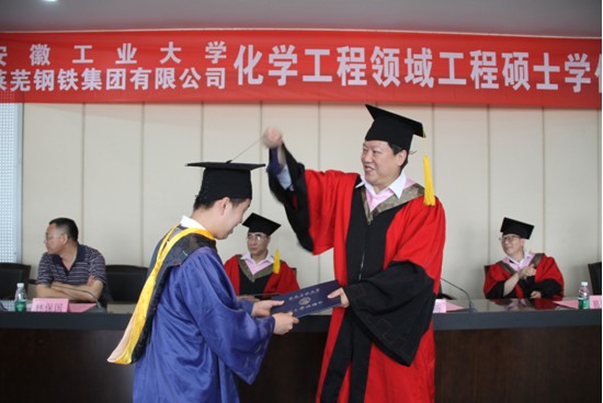 5月21日上午,安徽工业大学与莱芜钢铁集团有限公司(简称莱钢)化学工程领域工程硕士学位授予仪式在安徽工业大学学术会议中心隆重举行。校学位委员会主席、校长李家新教授,校学位委员会副主席、副校长葛芦生教授,以及莱芜钢铁股份有限公司人力资源部林保国主任,校学科建设处处长郑明东教授、研究生学院院长潘紫微教授、化学与化工学院院长崔平教授出席仪式,研究生学院、化学与化工学院有关负责人和导师们,全体授予学位的莱钢学员及化学与化工学院在校研究生代表等60多人参加了仪式。仪式由潘紫微主持。