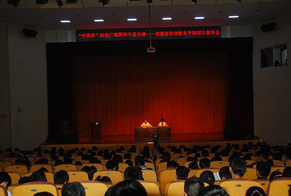 6月21日下午,省委宣传部副部长、省社科联党组书记、常务副主席、我校兼职教授徐东平在秀山校区大学生活动中心作了题为“中国梦的宽广视野与丰富内涵”的专题报告。副校长顾明言主持报告会。各学院学生工作负责人、辅导员老师,学工部、就业指导中心、团委等部门负责人以及500余名学生代表聆听了报告。