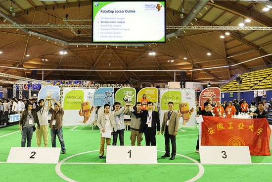 6月30日,在荷兰埃因霍温举行的第17届RoboCup足球世界杯赛场上,安徽工业大学校旗高高飘扬。而在万里之遥的我校计算机学院的师生们,听到学院Yushan2013队获得了机器人足球世界杯仿真2D组季军的消息后,无不奔走相告:“在RoboCup足球世界杯斩获季军,这是学校历史上的突破,了不起!”
