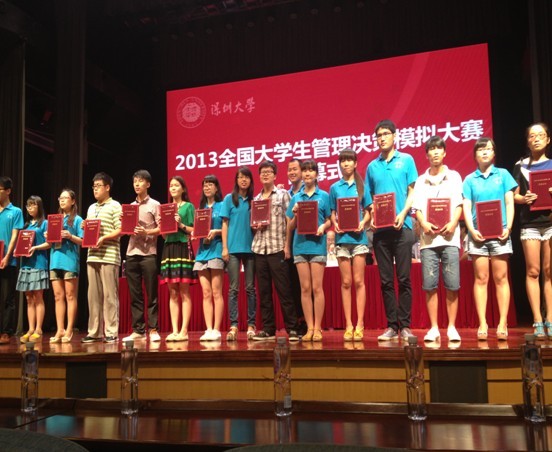 2013年“全国大学生管理决策模拟大赛”由教育部高等学校国家级实验教学示范中心联席会主办,深圳大学承办。大赛经过校内赛、预赛、复赛、半决赛、总决赛,历时4个多月。赛事自启动以来得到了来自全国600多所高校、近8万在校大学生的积极响应,共计22000多支团队参加了校内赛。经过层层比拼,最终来自83所高校的88支队伍闯入全国总决赛。88支参赛队伍按行业分8组,每组决出前2名共16支队伍进入总决赛答辩环节,我校选手不畏强手,经过一场斗智斗勇的博弈,最终以小组第一名的成绩进入总决赛的答辩环节。