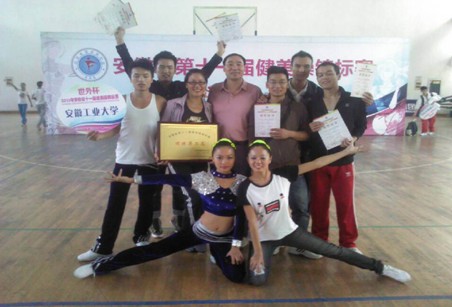 安徽省第十一届健美操锦标赛于10月12至13日在合肥世界外国语学校举行。27支代表队参赛,其中高校代表队有9支。比赛分为竞技组、大众组和舞蹈啦啦操自选动作组共三个组别,我校代表队在大众组的5个项目比赛中分别获得女单、混双、3人和5-12人操四个项目的冠军;机械学院孙浩同学带伤坚持比赛,他以优美的舞姿和轻快的舞步赢得了裁判员的青睐,最终获得男单第二名。