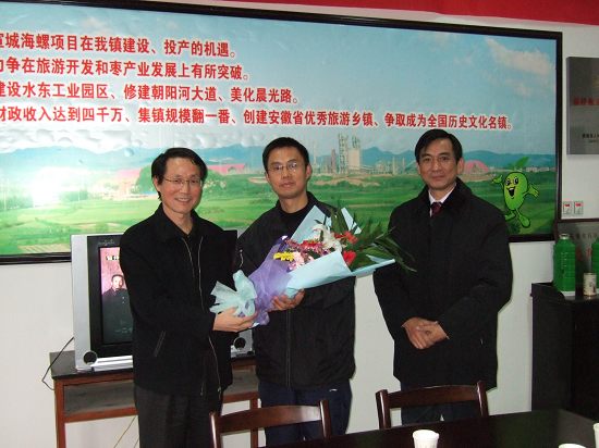 季爱华向领导们汇报了在水东镇两年里的工作情况和工作体会,水东镇党委刘陈寅书记介绍了季爱华任职以来的工作情况和其在分管的教育工作和农村基层建设等方面作出的成绩。听到季爱华任职期间的工作得到当地组织的肯定,张荣国、陈润十分高兴。张荣国勉励季爱华要珍惜锻炼的机会,虚心学习、努力工作,按照省委的要求,在当地党委的领导下,争取支持和帮助,在新农村建设中发挥作用,为深入贯彻十七届三中全会精神,把党的农村工作政策落到实处作贡献。陈润在讲话中代表学校感谢省厅领导对选派干部的关心和爱护,感谢宣州区和水东镇的各级领导对季爱华同志的支持和帮助,他表示,我校应发挥人才优势,为新农村建设和加强学校和地方合作积极提供智力支持,他希望季爱华同志再接再厉,在余下的一年里,加倍努力,以出色的成绩回报省委教育工委领导的关心和水东镇人民的支持。
