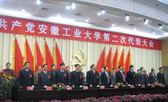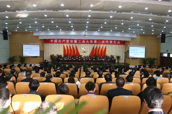 初冬的校园,彩旗飘扬,今天的报告厅内气氛格外庄严热烈,大会主席台上方悬挂着“中国共产党安徽工业大学第二次代表大会”的会标,后幕正中是金光闪闪的党徽,鲜艳的红旗分列两侧,主席台前的鲜花色彩绚丽,主席台正面墙上悬挂着“深化改革,科学发展,为建设高水平教学研究型大学而努力奋斗”的大幅标语,会场装点得喜庆吉祥。省委教育工委常务副书记张荣国,马鞍山市市委常委、组织部部长魏尧,省委组织部企事业干部处处长钱岩松,省委教育工委组干处副处长王忠等应邀出席了开幕式。