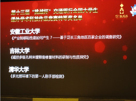 新闻提示:在刚刚结束的第十三届“挑战杯”全国大学生课外学术科技作品竞赛决赛中,我校参赛作品《产业转移粘性是如何产生的?——基于泛长三角地区百家企业的调查研究》荣获特等奖。这是安徽代表团在本届“挑战杯”国赛中取得的唯一特等奖,也是安徽省属高校在“挑战杯”国赛历史上第一个特等奖。