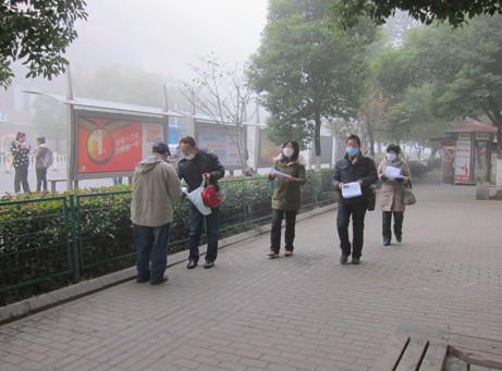 一周以来罕见的雾霾笼罩着马鞍山这座被誉为”江南一枝花”的全国卫生文明城市,浓重的雾气混合着尘土的气息,让每一个置身其中的行人都感到极为不适,12月8日,农工党安徽工业大学支部的几位老师戴着口罩,向过往行人发送传单。路人接过传单,发现上面介绍的是如何应对雾霾天气的小知识后,有的人还折回身来主动来要上二三张,说是带回去给周围的人都看一看。