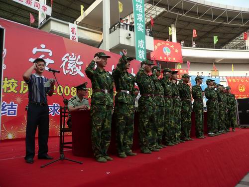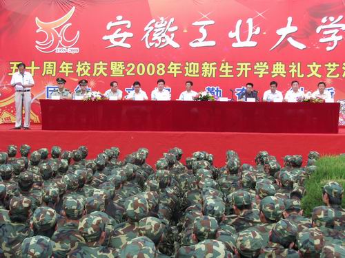 9月10日下午,我校在东区第一教学楼广场隆重召开2008级新生开学典礼暨军训动员大会。校领导李辉生、岑豫皖、李家新、林钟高、汪光阳、陈润、葛芦生,校督导员李明,马鞍山军分区副参谋长戚煦中校,武警马鞍山市支队领队教官曹海峰少校与我校2008级4000多名新生及承训武警教官参加了大会。大会由副校长林钟高主持。