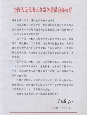 校庆贺信:全国人大常委会副秘书长王万宾贺信