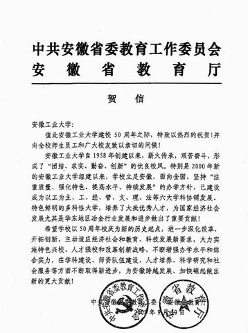 校庆贺信:安徽省委教工委省教育厅贺信