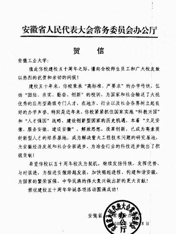 校庆贺信:安徽省人大常委会办公厅贺信