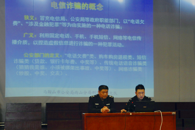 周韬以“常见电信诈骗案件及其防范措施”为主题,运用发生在大学生中间的典型诈骗案例,剖析罪犯心理,概括案件特征,告诉每位大学生,诈骗案件常发于身边,告诫学生现在诈骗手段层出不穷,方式更加隐蔽,更加让人迷惑,打击力度越来越难,遇到可疑保持冷静。他重点讲解了近年来冒充电信、邮政、公安、检察等部门实施诈骗;冒充亲朋好友、以各种方式实施诈骗;通过网络、手机短信发布虚假中奖信息实施诈骗;通过钓鱼网站以网银升级为诱饵实施诈骗等常见的诈骗手段,并告诉大家应对和防范措施。他还结合宿舍偷盗案件,提醒学生要养成良好习惯,妥善保管贵重物品和财物,做到随手关门,人走锁门。讲座深入浅出,案例详实、精彩生动,赢得了同学们的好评。