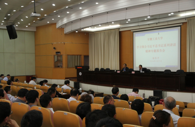 根据我校学习习近平总书记系列讲话和党的十八届三中全会精神培训班工作安排,5月9日下午校党委邀请了中共安徽省委宣传部副部长,安徽报业集团党委书记、社长徐东平来校作了一场题为《学习领会习近平总书记系列讲话精神》的专题辅导报告会,校党委中心组成员、全校处级干部、马克思主义学院全体教师、全校学生辅导员以及党委组织部、宣传部、学工部等部门全体干部共计近300人参加了报告会。报告会由校党委书记刘新跃主持。