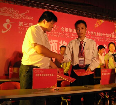 此次大赛吸引了全省9家单位到现场进行风险投资签约,我校“格斯制冷有限责任公司”项目与安徽马鞍山德隆制冷设备厂现场签订了“项目研发合作协议”;“绿环能源开发有限公司”项目与马鞍山高新技术创业服务中心(马鞍山市大学生创业园)现场签订了“项目入园意向书”,协议投资额1千多万,占大赛吸引风险投资总额1/5。