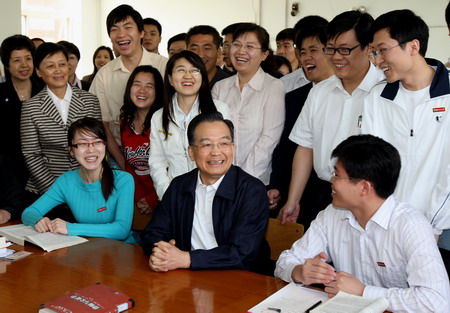 沿着绿树掩映的校园小路,温家宝走向学生宿舍。还有几百米的距离,学生们就挥动双手、欢呼着迎接总理。在一间狭窄的学生宿舍里,同学们把总理围在中间,亲热地聊了起来。总理对大家说,希望你们发奋学习,既要学好专业,又要开阔视野,成为现代化建设的杰出人才。