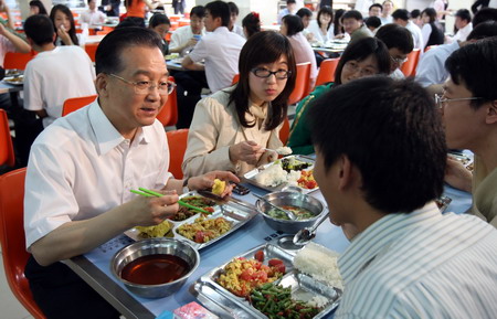 中午时分,温家宝走进了学生食堂,拿起托盘来到窗口前,要了一份苦瓜炒肉、西红柿炒鸡蛋和一块发糕,径直走到长条桌旁,与同学们一起谈笑风生,津津有味地吃起了午餐。