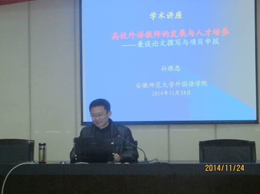 应外国语学院邀请,安徽师范大学外国语学院院长、博士生导师、教育部留学回国人员基金评审组专家、安徽省外国语言文学学会会长、省高等学校中青年学科带头人孙胜忠教授于11月24日下午在学术会议中心为外国语学院教师及部分学生作了题为“高校外院教师的发展与人才培养—兼谈论文撰写与项目申报”的专题报告会,报告会由洪流副院长主持。
