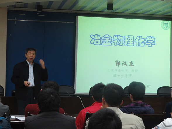 郭汉杰介绍了冶金物理化学这一基础科学的理论体系,解读了冶金物理化学中一些理论概念的理解误区。他生动形象地解释了炼铁与炼钢的基本原理,并用氧势图的基本原理解释了社会学领域一些现象的本质。郭教授的报告旁征博引,深入浅出,为参会师生上了一堂生动的冶金物理化学精品课。郭汉杰教授还与学院相关负责人及部分教师进行了座谈,与大家分享了自己的教学心得和学术见解。