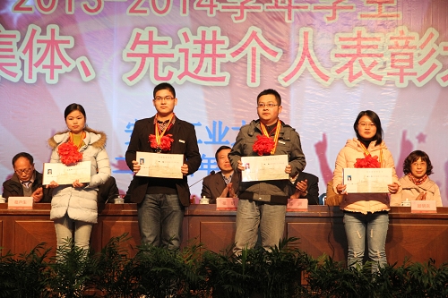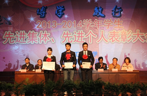 在雄壮的国歌声中,表彰大会拉开序幕。葛芦生副校长宣读了2013—2014学年本科生等表彰决定。伴随着颁奖视频展示,校党委书记刘新跃等校领导为获得国家奖学金、国家励志奖学金、宝钢奖学金、校长奖学金,创青春大赛国家金奖等团队,社会实践优秀团队、校“三好学标兵”、校“十佳班级”以及2014年校辅导员职业能力大赛获奖辅导员老师、“2014全国高校辅导员年度人物”等十大类奖项的先进集体、先进个人代表颁发奖牌、证书。
