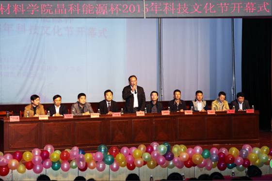 刘新跃宣布材料科学与工程学院“青春激扬梦想,科技创造未来”晶科能源杯2015年科技文化节正式开幕。材料学院党委书记徐柳根、晶科能源有限公司人力总监宋建红、天创科技有限公司总经理朱力冶、学生代表陈政分别在会上致辞和发言。