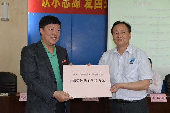 董金山同学代表81级全体同学捐赠“安徽工业大学钢院81级荣校基金”、李家新校长代表母校和母校基金会接受捐赠。