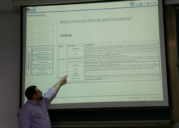 Luca博士通过对概念化、方法论、数据分析三个阶段的分析,向学生展示了开展学术研究的基本步骤和方法。结合专业特点,重点介绍了定性研究与定量研究的模型设置以及数据的分析。Luca幽默风趣,与在场师生积极互动,现场气氛热烈。